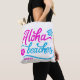 Hot Pink Aloha Strände Sommer Pun Personalisiert Tote Tasche. Festliche und farbenfrohe Sommertote Tasche mit handgeschriebenen "Aloha Beaches" Zitat mit Hibiskus Blumenakzenten in Magenta und Blau. Dieses Sommer Pun Tote Tasche ist perfekt als personalisiertes Geschenk.