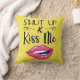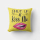 Dieses trendige Kuss-Kissen-Kissen mit einem zeichn von magentafarbenen Lippenstift-Lippen-Lippen-Lippen-Lippen-Lippen-Lippen-Lippen-Lippen-Lippen-Lippen-Lippen-Lippen-Lippen-Lippen-Lippen-Lippen und der Aufschrift Shut up & Kiss Me in einem modernen, schwarz-gelben Schriftart.