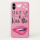 Dieser trendige Kuss-mir-Handy-Fall verfügt über einen zeichn eines Magenta Cartoon Lips und die Unterschrift Shut up & Kiss Me in einem schwarz-modernen Schriftart auf einem rosa Hintergrund mit weißen Herzen.