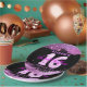 Diese individuell gestaltbare Papiertafel ist ideal für die Feier eines besonderen Anlasses! Die Platte hat einen schwarzen Hintergrund mit rosa Glitzer und fügt eine Touch Glamour zu Ihrem Party. In der Mitte der Platte ist eine große Zahl 16, die aus einem rosa Ballon in Form eines 1 und einem silbernen Ballon in Form eines 6 besteht. Über der Zahl 16 ist der Name des Prominenten in rosa Schriftart, und darunter ist die Phrase "16 . Geburtstag" in passendem Schriftart. Das Datum ist in einem kleinen rosa Schriftart unter "16 . Geburtstag" geschrieben. Dieser Teller fügt sicher eine persönliche Touch zu Ihrer Feier hinzu!