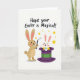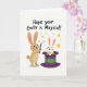 This greeting card features two cute bunny-like characters on a white background, sharing a sweet, friendly moment 🐰. On the left, a light brown character with rosy cheeks holds a thin black wand, and a few curling gray wisps rise from its tip as if a trick was just finished. Its round face and gentle eyes angle toward its companion, giving the scene a tender, “look what I did for you” kind of warmth. On the right, a bright white character pops up from a tall cylinder hat with alternating purple and green stripes, lifting one arm in an inviting wave 🐇. A small blue bow tie sits neatly at its neck, and its open, happy expression faces the brown character like it’s reacting with delighted affection. Scattered around them are golden-yellow stars in different sizes, floating in the open space to frame the pair. At the top, a short seasonal greeting appears in dark lettering, centered above the illustration, with the stars sprinkled between the text and the characters. The hat’s purple and green stripes stand out sharply against the white background, with the white character rising from the opening.
