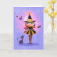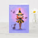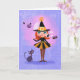 Vor einem schönen Lavendel- und rosa Hintergrund verwöhnt sich eine magische Hexe mit ihren Zaubern, während ihre seltsame schwarze Katze beobachtet. Original Illustration von Noël Snow.