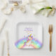 Adorable kid's birthday paper plates featuring a cute watercolor unicorn with pastel rainbow and surrounded by colorful stars. ideal party supplies for your little girls' birthday celebration!