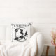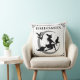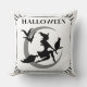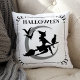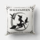 Feiern Sie Halloween im Stil mit diesem zauberhaften Kissen mit dekorativer Typografie, der Silhouette einer wunderbar bösen Hexe, die einen Besenstiel mit ihrer schwarzen Katze mit einem Halbmond und Fledermäusen im Hintergrund fliegt. Enthält einen Bildlauf und einen Sternrahmen auf einem weißen Hintergrund.