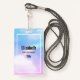 Personalisiertes Abzeichen mit einem weichen und hübschen Hintergrundbild. Pastel Blues und rosa Wolken mit einem magischen Regenbogen.