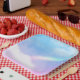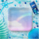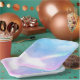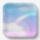 Papier Teller mit einem weichen und schönen Hintergrund. Pastel Blues und rosa Wolken mit einem magischen Regenbogen.