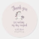 Zeigen Sie Ihre Wertschätzung mit unserem Magical Unicorn Dankeschön Sticker! Dieser wunderschön gestaltete Aufkleber zeigt eine charmante Einhorn-Illustration mit der herzlichen Botschaft: "Danke, dass du meinen Tag magisch gemacht hast." Das Design ist ein Set auf einem lila Hintergrund, der eine weiche, skurrile Touch zu Ihren Gastgeschenken, Geschenken oder Danksagungen. Dieses einmalige Dankeschön-Aufkleber ist der perfekte Weg, Dankbarkeit nach einer magischen, einzigartigen Geburtstagsparty zum Ausdruck zu bringen. Ob Sie Umschläge versiegeln, Gastgeschenke dekorieren oder einfach nur eine besondere Touch zu Ihren Dankeschön-Karten hinzufügen, diese Aufkleber werden einen bleibenden Eindruck verlassen. Die Hintergrundfarbe und der Schriftart können leicht an den Anzug Ihres Party angepasst werden, sodass Sie eine personalisierte Möglichkeit haben, "danke" zu Ihren Gästen zu sagen. Ideal für jede einmalige Feier!