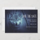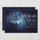 Save the Date Karte mit einem Bild eines magischen mystischen Wolfs stehend in einem Wald mit sanftem Schnee umfallen. Es sind auffallende blaue Augen, die wirklich Ihre Aufmerksamkeit erregen.