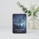 Visitenkarten mit einem Bild eines magischen mystischen Wolfs, stehend in einem Wald mit sanftem Schnee umfallen. Es sind auffallende blaue Augen, die wirklich Ihre Aufmerksamkeit erregen.