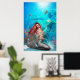 eine magische Meerjungfrau sitzt auf dem Meeresgrund und sieht sehnsüchtig auf dem Meeresspiegel aus - Silberfische schwimmen um sie herum
