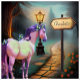 Vier Märchenaufkleber. Magisches Pferd und drei Prinzessinnen. Jeder Aufkleber kann mit dem Namen des Kindes oder einer anderen Nachricht angepasst werden. Aquarellbilder. Dress up your world with magical blue and lila vinylsticker. Fügen Sie eine Touch von Launen, wo immer Sie gehen! Ideal für den Schullocker, Notebooks, Tablet, etc.