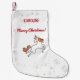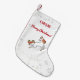 Niedlicher, mädchenhaft aber auch eleganter personalisierter WeihnachtsStrumpf mit einer Illustration eines magischen, glam Einhornpferdes mit goldenem und rotem Glitzer in seinem Mane und Schwanz, der Gruß "Frohe Weihnachten" in stilvoller, kursiver Schrift / Kalligrafie und einem individuelle Name. Das Design umfasst silberne und cremefarbene Schneeflocken und Sterne für eine festliche Urlaubsstimmung.