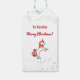 Niedliche, mädchenhafte und zugleich elegante personalisierte Weihnachtsgeschenktafeln mit einer Illustration eines magischen, glamourösen Einhornpferdes mit rotem und goldenem Mane und Schwanz, der Gruß "Frohe Weihnachten" in stilvoller, kursiver Schrift / Kalligrafie und einem individuelle Name. Das Design umfasst silberne und cremefarbene Schneeflocken und Sterne für eine festliche Urlaubsstimmung.