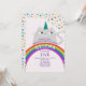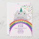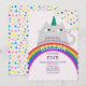 Niedliche, mädchenhafte, magische, regenbogenartige Geburtstagseinladung für Kinder, mit bunten Sternen und kawaii Katzeneinhorn.