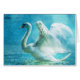 Ein charmantes, magisches und absolut wundervolles Bild eines weißen Schwans. Flappen und flattern, mit seinen prächtigen Flügeln, während Sie eine leichte sommerliche Regendusche genießen. Der Hintergrund und der Ton sind wunderschön türkisblau. Verjüngend und erfrischend. Das Bild hat eine bezaubernde Fantasiequalität.