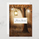 Eine Hochzeitseinladung mit einer skurrilen, bezaubernden Illustration in Braun- und Gelbtönen. Ein magischer mystischer Wald mit einem großen Baum, der eine alte Laterne hält. Luftlichter tanzen überall herum. Magisches mystisches Design.