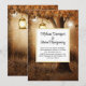 Eine Hochzeitseinladung mit einer skurrilen, bezaubernden Illustration in Braun- und Gelbtönen. Ein magischer mystischer Wald mit einem großen Baum, der eine alte Laterne hält. Luftlichter tanzen überall herum. Magisches mystisches Design.