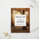 Save the Date Postkarte mit einer skurrilen, bezaubernden Illustration in Braun- und Gelbtönen. Ein magischer mystischer Wald mit einem großen Baum, der eine alte Laterne hält. Luftlichter tanzen überall herum. Ein bezauberndes, wunderbares Design.