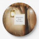 Papier Teller mit einer skurrilen, bezaubernden Illustration in Braun- und Gelbtönen. Ein magischer mystischer Wald mit einem großen Baum, der eine alte Laterne hält. Luftlichter tanzen überall herum. Ein bezauberndes, wunderbares Design.