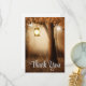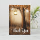 Vielen Dank Karte mit einer skurrilen bezaubernden Abbildung in reichen braunen und gelben Farben. Ein magischer mystischer Wald mit einem großen Baum, der eine alte Laterne hält. Luftlichter tanzen überall herum. Magisches mystisches Design.