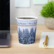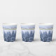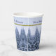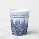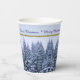 Diese Paper Cups zeigen einen schneebedeckten Winterwald. Schneebäume in blauen Tönen auf einem zarten Hintergrund mit dem Text "Frohe Weihnachten". Original Foto. Festliche, maßgeschneiderte Papiertassen für Ihr Weihnachtsfest!