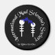 Schwarzer Magnet mit dem Siegel "International Mad Scientist's's Society" in weißer Schrift, ergänzt mit blauem Fraktal-Funken und lateinischem Motto "En Rabies Est Vox" (In Madness is Power)