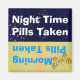 Farbenfroher quadratischer Magnet, der als medikamentöse Erinnerung hergestellt wurde. Der Magnet wird halb in dunkelblau und halb in gelb gehalten, mit goldenen Tonstern und weißen Glitzern auf der dunkelblauen Seite und einem goldgelben Schmetterling auf der anderen Seite. Der weiße Text auf der blauen Seite liest "Night Time Pills Taken", und drehe es drüber, und er liest "Morning Pills Taken" auf der gelben Seite des Magneten. Es macht es viel leichter, sich zu erinnern, wenn Sie Ihre Medikamente und ein großartiges kleines Geschenk für ältere Senioren, die neigen zu vergessen.