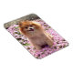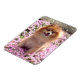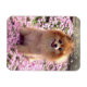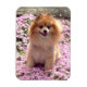 Spitz mit rosa Blume von Niedlichen Haustieren. Niedlicher Spitz namens Marley, der zwischen einem Feld rosa Blume sitzt. Foto von Sequin Dreams aufgenommen. Design auf Magnet.