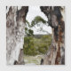Dieses Bild, aufgenommen in Loddon in Victoria, Australien, zeigt eine nahe Aufnahme eines ausgehöhlten oder teilweise verbrannten Baumstamms, der eine üppige, grüne Landschaft im Hintergrund umrahmt. Die Rinde des Baumes besteht aus einer Mischung aus schwarzen, karierten Flächen und glattem, hellen Holz, möglicherweise aufgrund von Feuer- oder Naturschäden. Durch die Öffnung im Baum sind sanfte Hügel mit viel Grün und verstreuten Bäumen sichtbar. Der Gesamteffekt schafft einen natürlichen Rahmen, der die Komposition tiefer macht, mit dem Kontrast zwischen der rauen, strukturierten Rinde und der weichen, entfernten Landschaft.