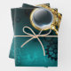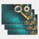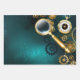 Eine antike Lupe mit goldenem Griff und konvexe Linse auf grünem Hintergrund mit goldenen Zahnrädern und einer antiken Uhr. Steampunkstil.