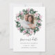 Elegante botanische speichern Sie die Daten mit einem bevorzugten Verlobung Foto umgeben von einem runden Kranz von rosa magnolischen Blume und eucalyptus Blätter in einer eleganten Aquarellpalette von Rosa und Grün. Die Karte kehrt sich in einem dunkelgrauen mit koordinierenden Blume um. Personalisieren Sie mit Ihren Namen, Hochzeitsdatum und Ort. Weitere Farben sind verfügbar