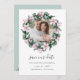 Elegante botanische speichern Sie die Daten mit einem bevorzugten Verlobung Foto umgeben von einem runden Kranz von rosa magnolischen Blume und eucalyptus Blätter in einer eleganten Aquarellpalette von Rosa und Grün. Die Karte kehrt sich in einem reichen Weissgrün um mit koordinierenden Blume. Personalisieren Sie mit Ihren Namen, Hochzeitsdatum und Ort. Weitere Farben sind verfügbar