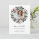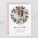 Elegante botanische speichern Sie die Daten mit einem bevorzugten Verlobung Foto umgeben von einem runden Kranz von rosa magnolischen Blume und eucalyptus Blätter in einer eleganten Aquarellpalette von Rosa und Grün. Die Karte kehrt sich in einem kräftigen weichen Rosa mit koordinierenden Blume um. Personalisieren Sie mit Ihren Namen, Hochzeitsdatum und Ort. Weitere Farben sind verfügbar