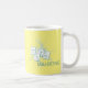 Eine Tasse für Mahjong-Liebhaber mit Mahjong-Fliesen und extravaganten Wirbel in hellblauer Farbe auf gelbem Hintergrund