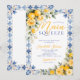 Main Squeeze Lemon Blue Italian Bridal Shower Invitation featuring vibrant Italian-inspired blue patterns, fresh lemons, and elegant floral accents. Perfect for a lemon bridal shower, lemon and blue bridal shower theme, or Italian themed bridal shower with a bright and festive summer feel.
