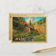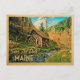 Vintag Maine Save the Date Postcard im lustigen Retro-Stil der Mitte des Jahrhunderts. Es verfügt über eine rustikale, waldreiche Naturlandschaft mit einer Holzhütte und Wasserradmühle, und einen hübschen Bachlauf mit Herbstlauben für Herbst- oder Sommerstimmung. Diese Maine-Save the Date-Postkarte ist ideal für eine Hochzeit auf dem Lande oder eine Hochzeit in Natur und Camping.