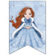 Dieses Geburtstagsbunting hat einen verschneiten Hintergrund hinter den Briefen, die "Happy Birthday" buchstabieren. An jedem Ende ist eine Märchenprinzessin, die ein blaues Kleid trägt.