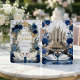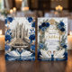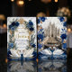 Bestimme den Ton für eine großartige Märchenhochzeit mit diesem majestätischen Kathedralendesign. Es zeigt elegante Schwäne, königliche blaue Blumen und aufwendige barocke Details. Dieses Design zeigt eine digitale Illustration eines großartigen Kathedraleninneren, das an den Dom von Mailand erinnert, mit einer geschwungenen Treppe und einem weißmarmornen Boden. In der Mitte bilden zwei weiße Schwäne einen Herzrahmen innerhalb eines mehrstufigen Brunnens, akzentuiert durch einen gedruckten goldenen Glitter-Wassereffekt. Die Szene wird von einem aufwendigen barocken Torbogen eingerahmt, der mit navyblauen und staubigen blauen Rosen mit falschen goldenen Metallblättern drapiert ist. Die Typografie kombiniert elegante goldene Kalligrafie mit klassischen Serifenschriften vor einem cremeweißen Hintergrund. Es handelt sich um ein flaches ged