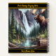 Ein ruhiger Elch liegt an einem schimmernden Fluss, umgeben von großen immergrünen und kaskadenförmigen Wasserfällen. Berggipfel erheben sich im Hintergrund und erfassen das Wesen der Wildnis. HINWEIS zum Ändern von Text- oder Grenzfarben mithilfe des Entwurfstools Bearbeiten