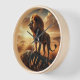 Ein majestätischer Löwe steht stolz auf einem Felsen inmitten der afrikanischen Savanne. Die Szene ist in warmes, goldenes Licht eines Sonnenauf- oder -untergangs getaucht, was die beeindruckende Mähne des Löwen hervorhebt. Im Hintergrund erstreckt sich die weite Natur mit hohen Gräsern, vereinzelten Akazienbäumen und sanften, fernen Hügeln. Der Himmel zeigt leichte Wolken, die der Szenerie eine zusätzliche Tiefe und Atmosphäre verleihen. Die Darstellung ist realistisch und detailreich, mit Fokus auf den Texturen des Fells und der Umgebung.