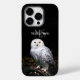 Tierporträtfotografie der majestätischen, schneebedeckten Eule, die auf einem Zweig mit einem personalisierbaren individuelle Name-Monogramm oben stehend ist.