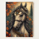 Edelpferd mit verziertem Goldhack mit blauen Juwelen, umgeben von pulsierenden Herbstblättern und einer Waldlandschaft, die Eleganz und Fantasie hervorruft.