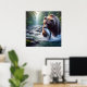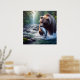 Ein großer Bär wird in einem bemalten Kunstwerk dargestellt und hält einen frischen Fisch fest im Mund. Die mächtige Präsenz der Bären und die natürlichen Jagdinstinkte werden in den Kunstwerken lebendig dargestellt.
