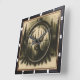 Die quadratische Wanduhr zeigt ein beeindruckendes Bild eines majestätischen Hirschkopfes, der in den Keilhainen eines Gewehr-Skotts gerahmt ist, und das Set vor der Kiefernkuppe. Das sepiatfarbene Kunstwerk erinnert an eine klassische Jagd-Ästhetik, die es zu einem idealen Stück für Jäger, Lodge-Dekoration oder für alle, die die Wildnis schätzen.