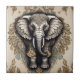 Majestic Elephant Mandala. Illustration eines Elefanten in der Mitte, aufwändig entworfen mit Mandalasen und Blumenmotiven. Der Kopf des Elefanten ist mit aufwändigen Designs geschmückt und fügt sich nahtlos in seine natürlichen Eigenschaften ein. Der Elefant ist von zarten, symmetrischen Blumenmustern umgeben, mit Blätter und Blume in beigen, braunen und sanft blauen Farbtönen. Das gesamte Bild hat eine harmonische und ausgewogene Zusammensetzung, die ein Gefühl von Eleganz und Ruhe schafft.