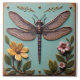 A square tile with a turquoise background, featuring a raised design of a dragonfly, flowers, and foliage. The dragonfly is centrally positioned with its body running vertically down the tile. It has a purple body with gold accents and large, detailed wings that are brown with purple veins and gold outlines.