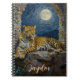 Leopard themed personalized notebook. On the front is an illustration of a majestic leopard with fur like molten gold, laying on a cliff ledge bathed in ethereal moonlight. Intricate carvings adorn crumbling stone pillars, and bioluminescent flora casts a soft, otherworldly glow. The scene is rendered in a rich, textural oil painting style with thick strokes.