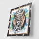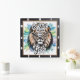 Diese markante quadratische Wanduhr besticht durch einen majestätischen Löwen mit einer fließenden Mähne in Schwarz, Weiß und aquamarin, die aus einem Aquarellhintergrund hervorgeht. Die mächtige Schrift "Sei still und weiß, dass ich Gott bin" aus Psalm 46:10 ist elegant überlagert und schafft ein inspirierend und ruhiges Stück spiritueller Kunst.