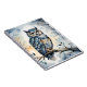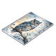 Eine majestätische Eule steht auf einem Ast in einem ruhigen, schneebedeckten Wald. Die Orangenaugen der Eule heben sich von ihren blauen Federn ab, die mit komplizierten Mustern, die an Schneeflocken erinnern, verziert sind. Der Hintergrund ist mit schneebedeckten Bäumen bedeckt, und das weiche Glühen der Sonne filtert durch den Nebel und verleiht der Szene eine mystische Qualität. Die Atmosphäre ist ruhig und bezaubernd, was die Schönheit eines winterlichen Waldes einnimmt.