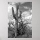 Ein Saguaro-Kaktus, mehrere Hundert Jahre alt und sehr groß, bringt Weine mit einem Wüstenbaum gegen einen bewölkten Himmel.